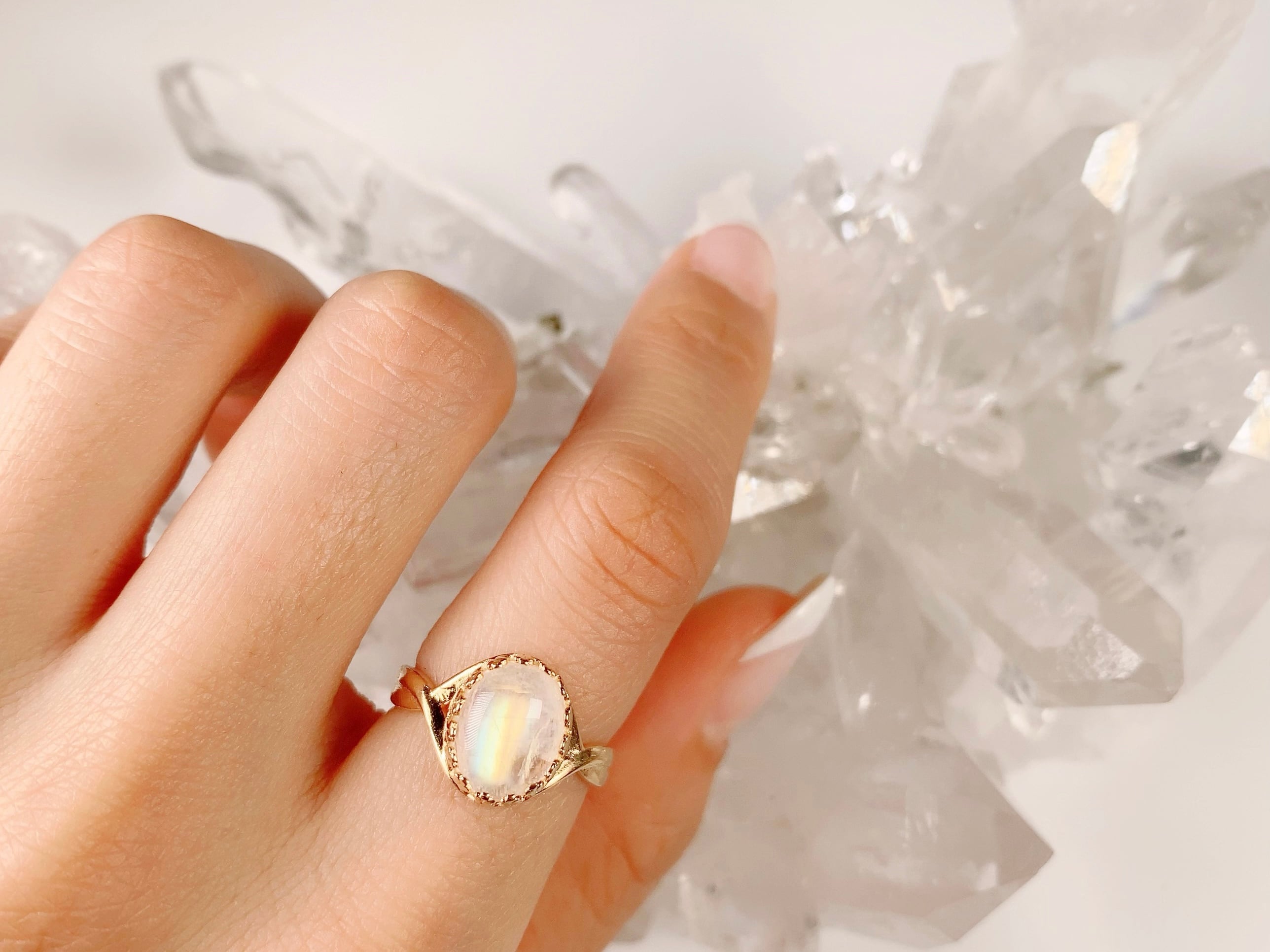 【素材】宝石質レインボームーンストーン、ヴェルメイユゴールドリング